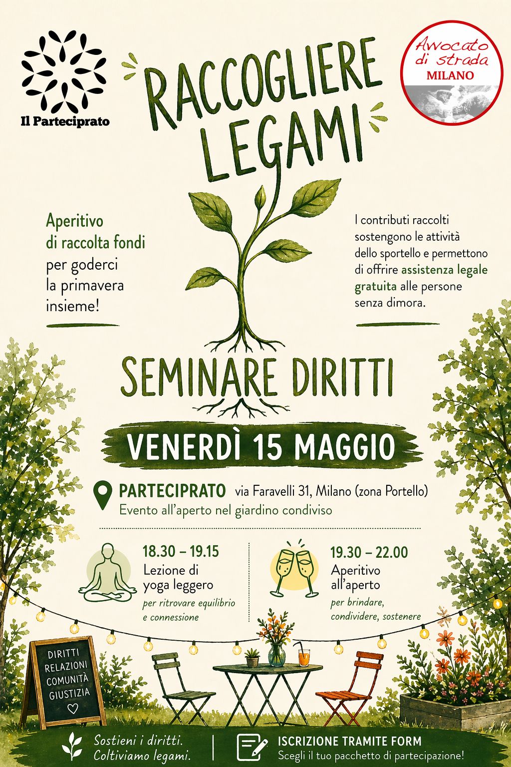 Per goderci la primavera in compagnia, come ogni anno, Avvocato di strada Milano organizza un aperitivo di raccolta fondi che permette un autofinanziamento.