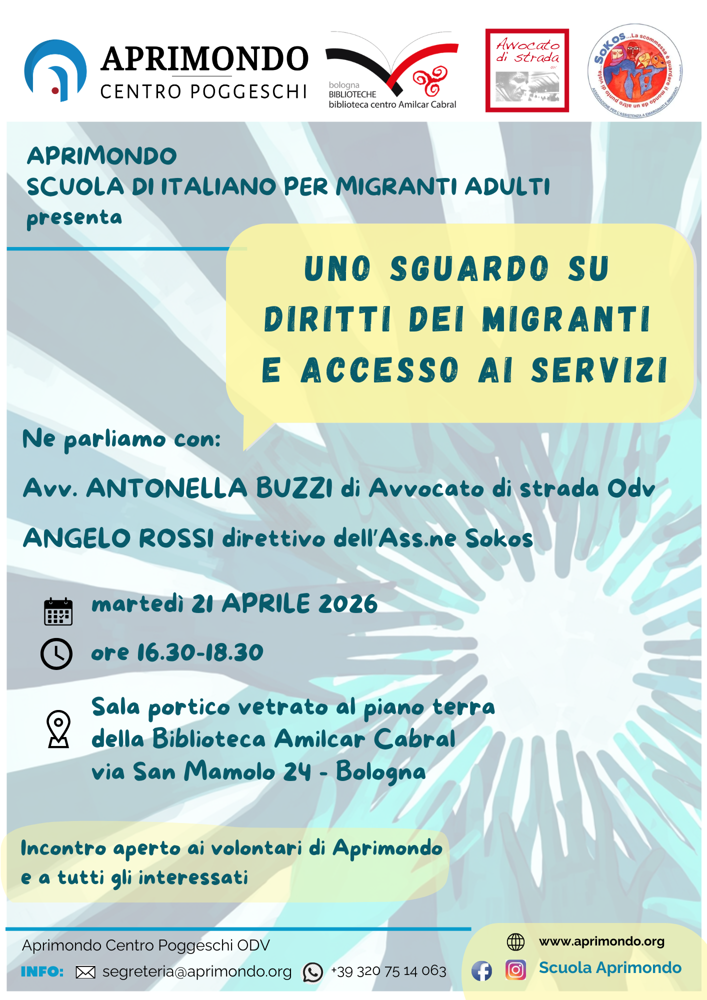 APRIMONDO SCUOLA DI ITALIANO PER MIGRANTI ADULTI in collaborazione con Biblioteca Amilcal Cabral, Avvocato di strada e Sokos presenta “UNO SGUARDO SUI DIRITTI DEI MIGRANTI E ACCESSO AI SERVIZI”